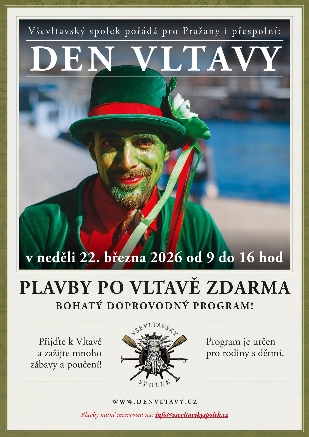 Již tradiční akce pořádaná Vševltavským spolkem Den Vltavy se letos koná v neděli 22. března od 9 do 16 hod. Jako každý rok se chystá bohatý program. Sledujte stránky www.denvltavy.cz.